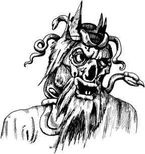 The finale can be staged in a couple ways, depending on the GM’s intent. The players may find the Shrine just as Grubsucker is preparing to sacrifice his victim. In that case, Mongweh is tied up and vulnerable, but still alive. If the players take their time responding, however, Mongweh will be dead, and Grubsucker will have begun his last meal. For a truly dramatic climax, the PCs might fight their way into the shrine just as Grubsucker is finishing up the meal, but that would require the characters to take their time responding to the kidnapping (or miss a number of Tracking rolls).