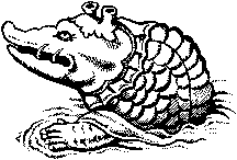 The Marsh Haggis is descended (in both senses) from the well-known mountain haggis. This famous beast hardly needs describing: the round, hair-less body, the long luxuriant white tail in which it wraps itself when asleep, the asymmetrical leg length enabling it to run around mountains, the plaintive wailing cry that echoes from peak to peak in the mating season.The marsh haggis (pl. haggi) is a similar beast in many ways. The body is somewhat more streamlined, befitting its aquatic existence, but the asymmetrical legs and the furry tail remain (the tail shorter and flatter than in the mountain species). Young haggi have a mere stump of a tail to begin with. This combined with their leg length means that in their youth they can only swim in circles: a safety measure, ensuring that they can never get far from their parents or deep into the Marsh. As the tail grows, its usefulness as a steering device increases, and adult haggi can swim in any direction they wish.